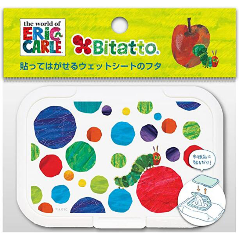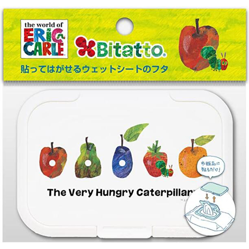●ウェットシートの取り口に貼るだけで乾きにくく取り出しやすくしてくれる、便利なフタ「ビタット」に、大人気「はらぺこあおむし」が仲間入り! 鮮やかな色彩と独特のタッチ「はらぺこあおむし」の世界が、そのまま「ビタット」になりました!